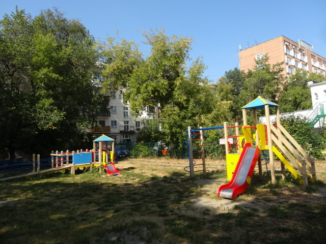 У дома свой закрытый уютный и зеленый двор с детской площадкой.