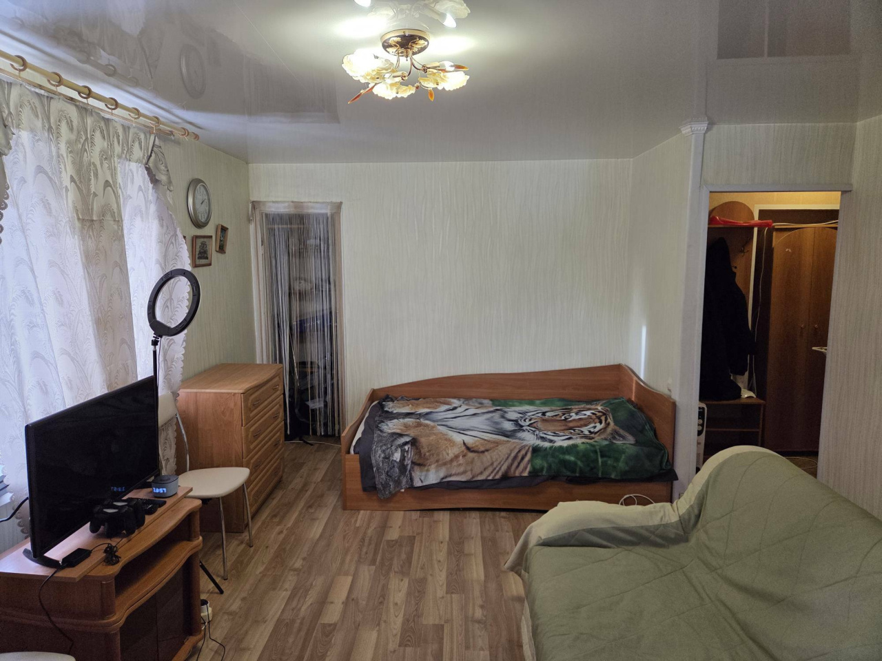 стиральная машина и мебель в комнате. Есть небольшая гардеробная.